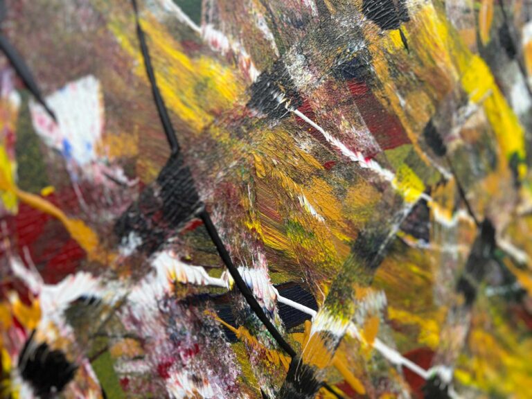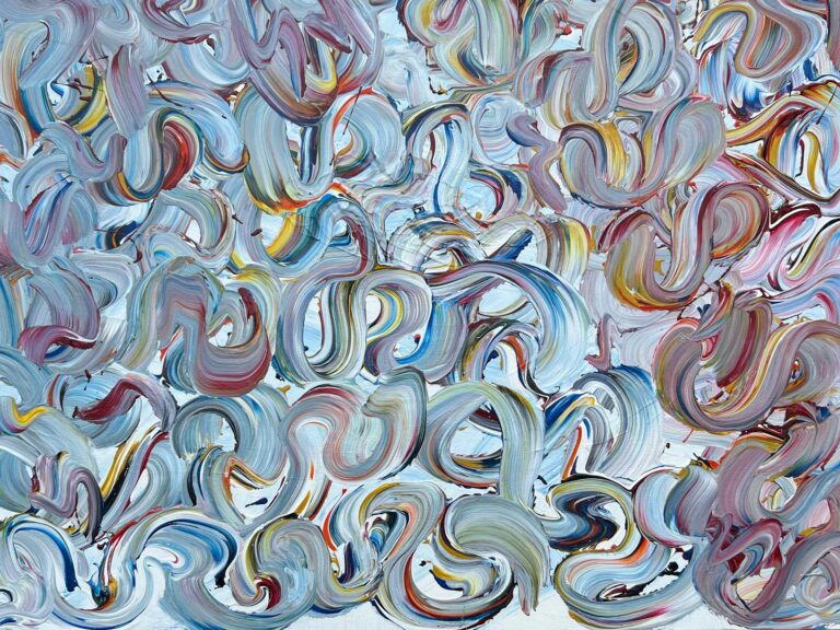 This piece of acrylic on two canvases reaches from one to the other to combine their connectedness.